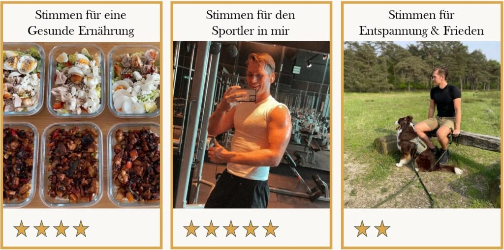 In einem anderen Artikel habe ich bereits erwähnt, dass ich mich gerne dafür belohne, wenn ich bewusst eine Stimme für meine beste Version abgegeben habe. So lege ich mir beispielsweise für jede absolvierte Trainingseinheit vier Euro auf ein separates Sparkonto, um mir – wenn genug zusammengekommen ist – neue Sportkleidung zu leisten. Auf diese Weise werden meine Stimmen für ein fitteres und gesünderes Ich sichtbar, und ich erkenne sehr ehrlich, wie konsequent ich in letzter Zeit gewesen bin oder ob ich vielleicht weniger getan habe, als ich gedacht habe.